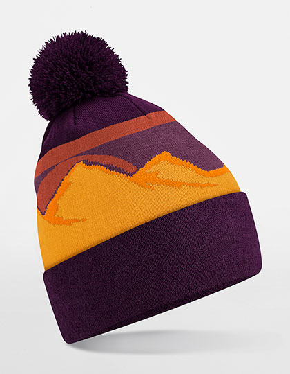 100% gerecycleerd polyester | Gedurfd ontwerp met berglandschap | Effen pompon | Manchet design | Afscheurbaar etiket