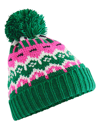 Volledig fleecevoering van gerecycled polyester | 56% gerecycled polyester | Tijdloos Fair Isle-patroon | Klassieke stijl | Eenkleurige pompon | Omgeslagen rand voor optimale decoratie | Afscheurbaar label voor eenvoudige rebranding
