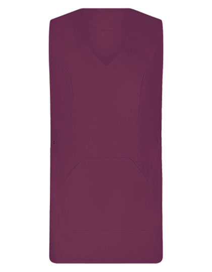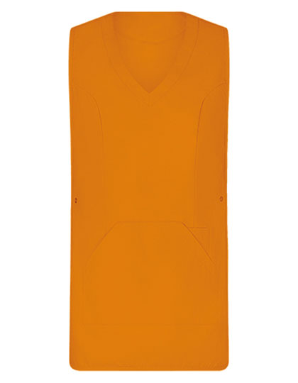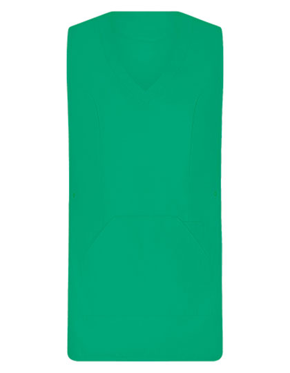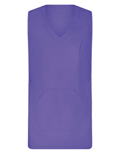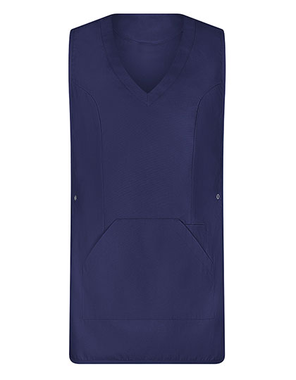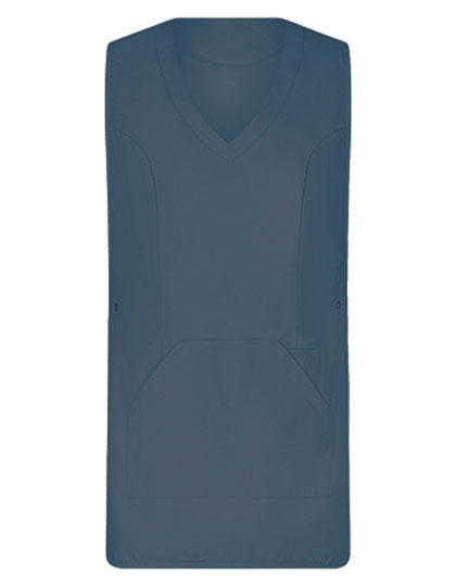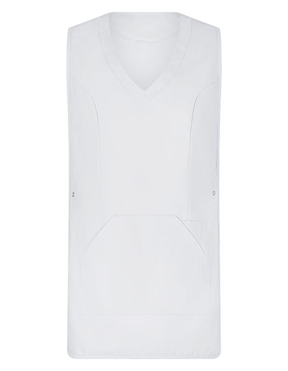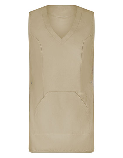 Tabberd met zeer zacht oppervlak | Aanpasbaar met drukknopen aan de zijkanten | 1 grote zak met zijopening | 1 smalle zak (links) voor pennen enz. | V-hals
