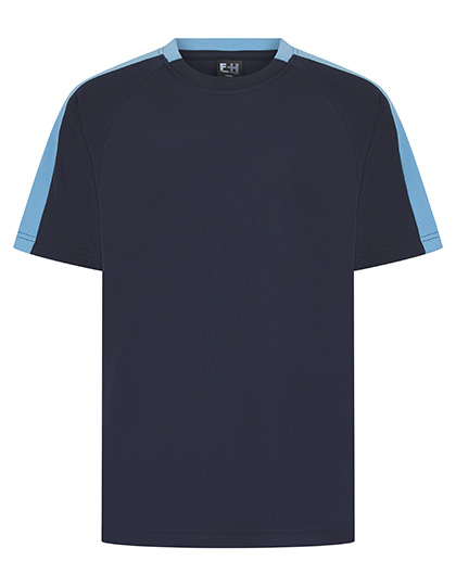 Single jersey | Uniseks | Contrasterende mouwpanelen in dezelfde stof | Sportieve pasvorm | Ademende finish zorgt voor vochtafvoer | Sneldrogend en ademend | Tweedelige kraag van dezelfde stof | Raglan schouder | Afscheurbaar etiket