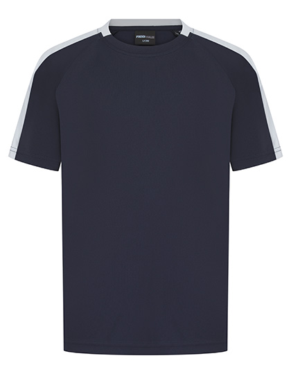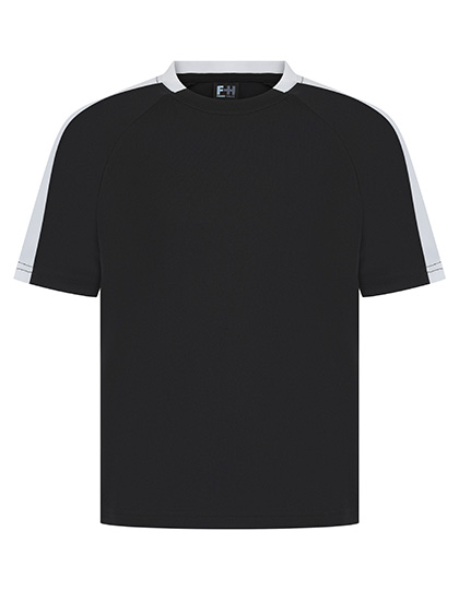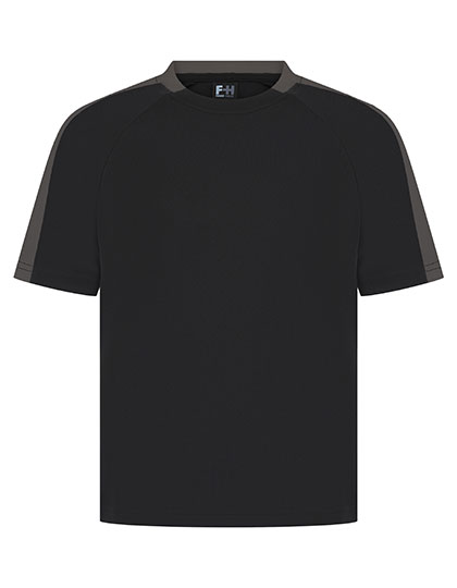 Single jersey | Afvoerende afwerking op stof | 2-delige contrasterende kraag | Ronde halsuitsnijding | Raglan mouw | Contrasterende zijpanelen uit dezelfde stof op de mouw | Afscheurbaar label