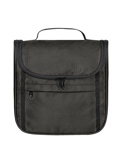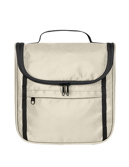 Toilettas om op te hangen of rechtop te zetten | Gerecycleerd materiaal aan de buitenkant | Voorvak met rits | Bandje met lus aan de voorkant | Driezijdige ritssluiting in 2 richtingen | Rits compartiment in de omslagflap | Vier steekzakken uit gaas aan de binnenkant | Handvat