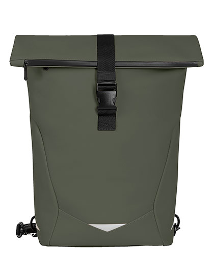 Oprolbare rugzak met waterafstotende ritssluitingen | Gerecycleerd buitenmateriaal met waterafstotend effect | Hoofdvak met rits en gespsluitingen aan de zijkant | Groot voorvak met rits | Decoratieve reflecterende print op de voorkant en zijkanten | Gewatteerd insteekvak met klittenbandsluiting binnenin | Insteekvak voor GPS-tracker | Bevestigingslus voor trolleyhandgrepen | Voor bevestiging aan fietsenbagagedrager aan de achterkant | Gevoerde schouderbanden die omlaag kunnen, met individueel verstelbare borstband | Handvat
