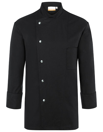Keperbinding, 215 g/m² | Zeer verfijnd, voorgekrompen, kleurvast, onderhoudsvriendelijk | Koksbuis voor mannen met normale snit | Prinsessenzoom op het achterste deel | Geventileerde manchetten | Schuine borstzak links, met pennenzak | Jas met 5 knopen en drukknopen | Geschikt voor industrieel wassen | Wasbaar tot 95 °C