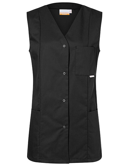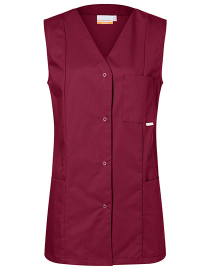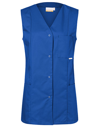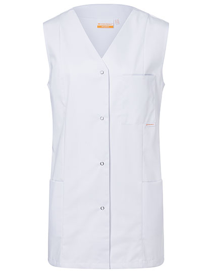 Keperbinding, 215 g/m² | Zeer verfijnd, voorgekrompen, kleurvast, onderhoudsvriendelijk | Tuniek voor dames met losse snit | Engelse naden | V-hals, mouwloos | Twee verborgen zijzakken | Steekzak op linkerborst | Vier drukknopen | Ruglengte bij maat 38 ca. 82 cm | Geschikt voor industrieel wassen | Wasbaar tot 95 °C