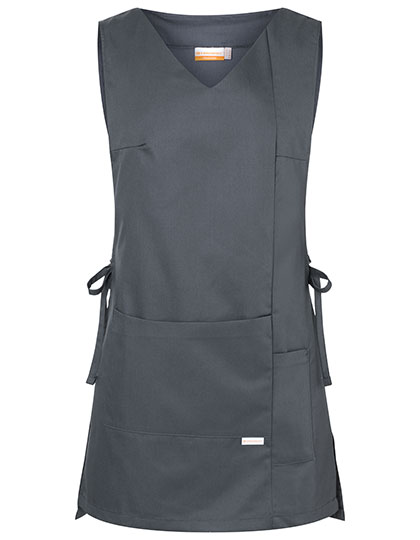 Keperbinding, 215 g/m² | Zeer verfijnd, voorgekrompen, kleurvast, onderhoudsvriendelijk | Overslag schort van gemixte materialen | Twee opgestikte zakken aan de voorkant | Aan de zijkant vast te binden | Ruglengte voor maat L ca. 83 cm | Geschikt voor industrieel wassen | Wasbaar tot 60 °C (antraciet tot 95 °C)