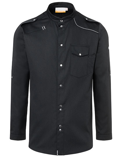 Keperbinding, 150 g/m². | Zeer verfijnd, voorgekrompen, kleurvast, onderhoudsvriendelijk | Chef shirt gemaakt van speciaal lichtgewicht materiaal | Lichtgrijze contraststiksels, moderne opstaande kraag en flappen op de schouders voor een unieke look | Drukknopen | Borstzak | Twee verfijnde pennen naast de borstzak | Oprolbare en eenvoudige bevestiging van de mouwen met extra flappen | Geschikt voor industrieel wassen | Wasbaar tot 95 °C | Marineblauw: niet bleken