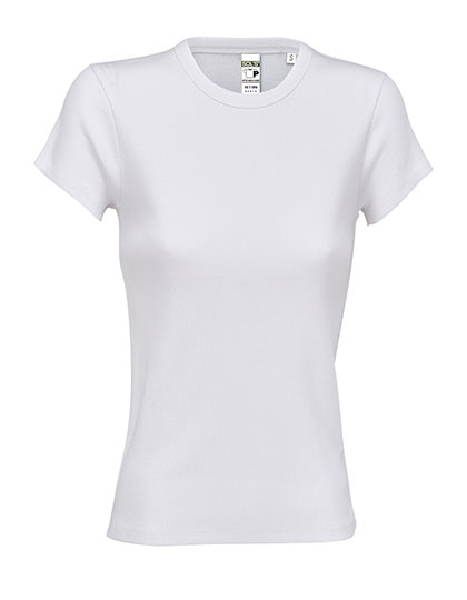 2x2 rib | Geconcentreerd ringgesponnen katoen | Vrouwelijk, getailleerd T-shirt | Ribboord | Nektape | Gesneden en genaaid | Scheurlabel